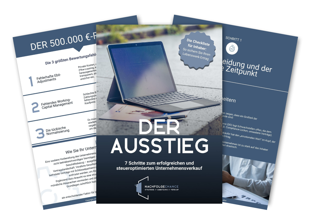 Ein erfolgreicher Unternehmensverkauf steht und fällt mit der richtigen Vorbereitung. In unserem Whitepaper zeigen wir Ihnen die 7 entscheidenden Schritte, die den Verkaufsprozess strukturieren und dafür sorgen, dass Sie den bestmöglichen Preis erzielen.